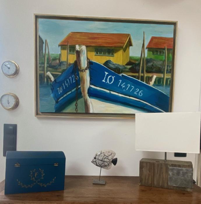 En parallèle des portraits sur carte, Babeth réalise des peintures originales sur toile, inspirées par les paysages marins et la lumière de l’Île d’Oléron.